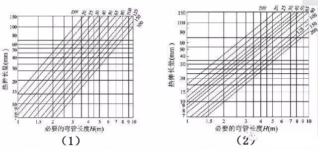 为简化计算,常用线算图来确定L型补偿器的短臂长度和Z型补偿器的中间臂长度。图二(1)是L型弯管段自然补偿线算图,(2)是Z型弯管段自然补偿线算图。